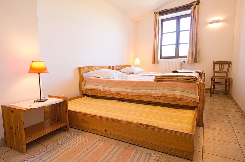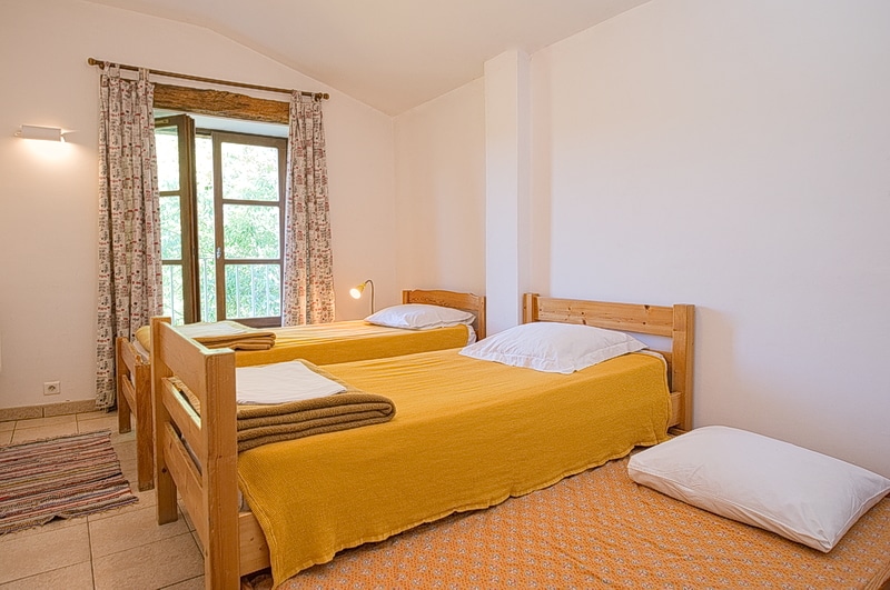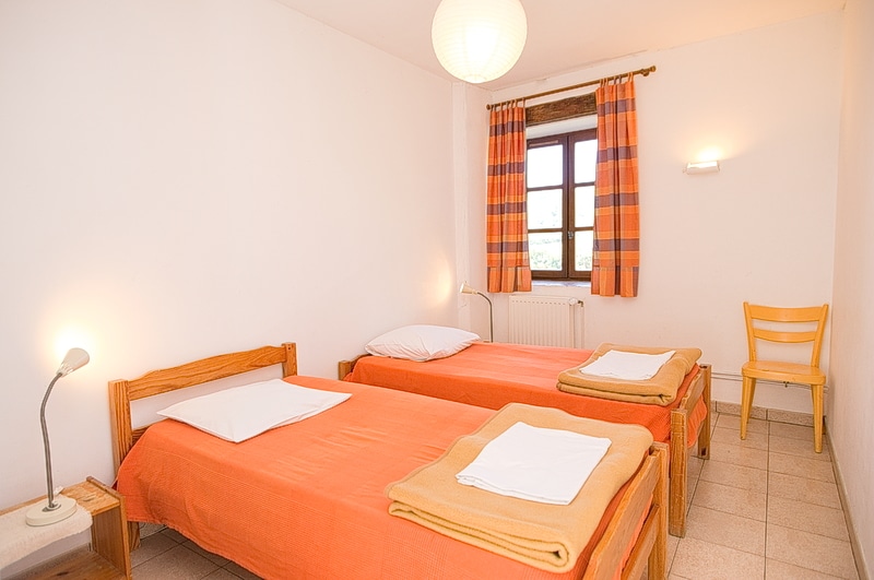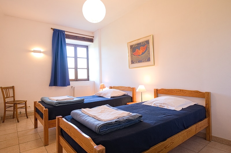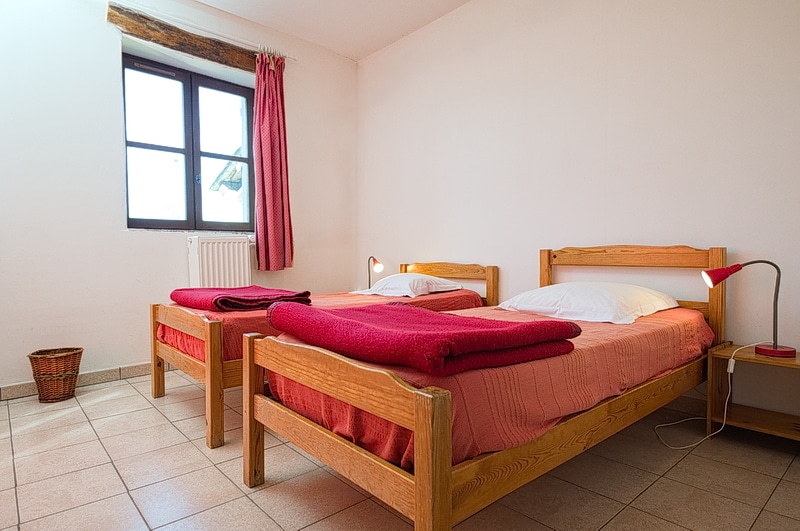 Deux parties séparées comprennent chacune une chambre avec 2 lits simples et une chambre avec 2 lits simples et 1 lit tiroir, wc/douche ou baignoire. Chaque chambre dispose de grands placards. L’un des paliers est équipé d’une petite table et d’une chaise.