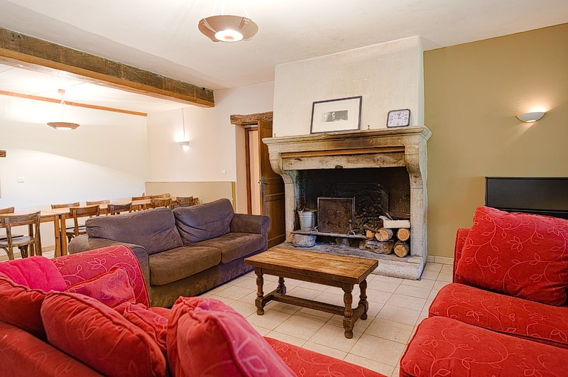 - Salle de séjour très spacieuse équipée d’une belle cheminée, d’un piano droit, de 7 tables modulables, 28 chaises, 3 canapés (10 places).