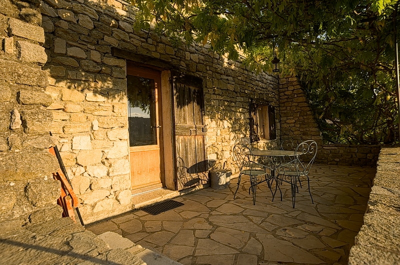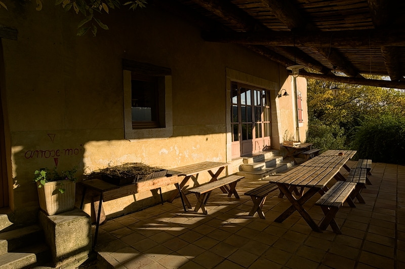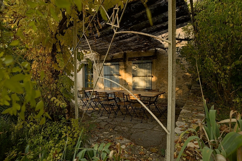 Grande terrasse abritée, à l’ombre fraîche en été, équipée de tables de jardin et de bancs pour plus de 30 personnes. Un barbecue XXL. Accès direct sur jardin avec vue imprenable sur les couchers de soleil et les champs de lavande.