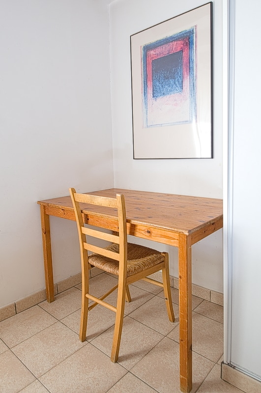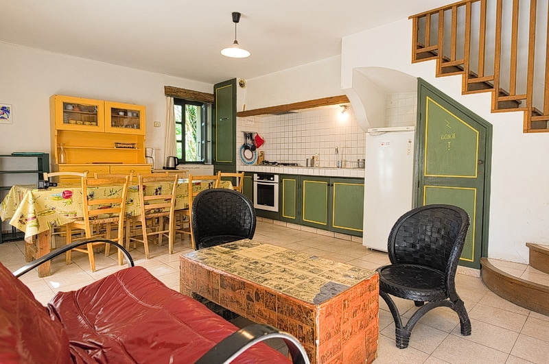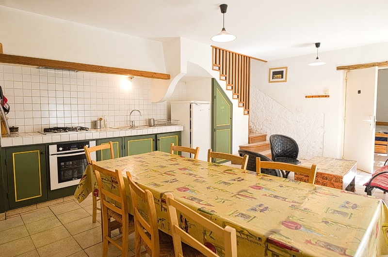 Au rez-de-chaussée : grande cuisine et salle à manger qui donnent sur une terrasse ombragée avec une grande table en faïence. Non disponible actuellement : WC et douche et une chambre de plain-pied.